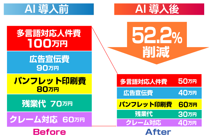 • 多言語対応人件費:AI翻訳チャットで24時間対応、人員削減。• 広告宣伝費:AIで観光客の属性に合わせたターゲティング広告を最適化。• パンフレット印刷費:電子ガイドやアプリ提供で印刷量が激減。• 残業代:繁忙期の対応をAI案内が分散処理。• クレーム対応:FAQ自動化で初期対応をAIが吸収。