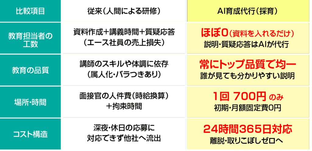 教育業務をAIにアウトソースすることで、社内の優秀な人材を「教育係」から解放し、本業での成果創出にコミットさせることができます